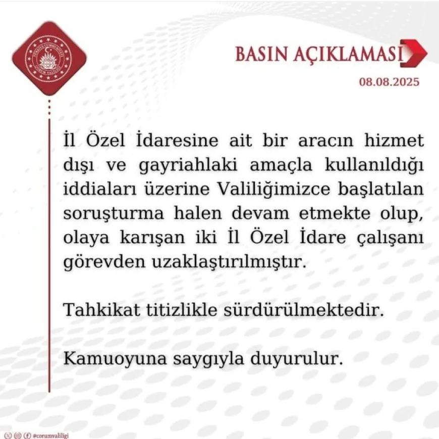 Çorum’da İl Özel İdaresine ait bir aracın, hizmet amacı dışında ve gayriahlaki şekilde kullanıldığı iddiaları üzerine Çorum Valiliği tarafından soruşturma başlatıldı.