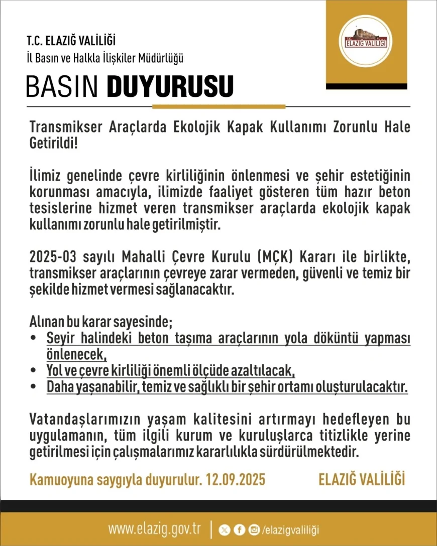 Elazığ Valiliği, çevre kirliliğinin azaltılması ve şehir estetiğinin korunması amacıyla yeni bir düzenleme hayata geçirdi. İl genelinde faaliyet gösteren tüm hazır beton tesislerine hizmet sağlayan transmikser araçlarda ekolojik kapak kullanımı zorunlu hale getirildi.